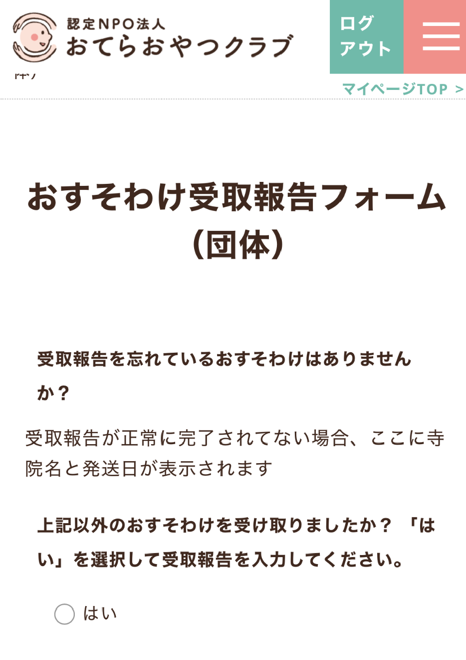 マイページ内からもおすそわけ受取のご報告が可能ですので、1日待ってもURLが届かない場合はマイページからご報告ください。