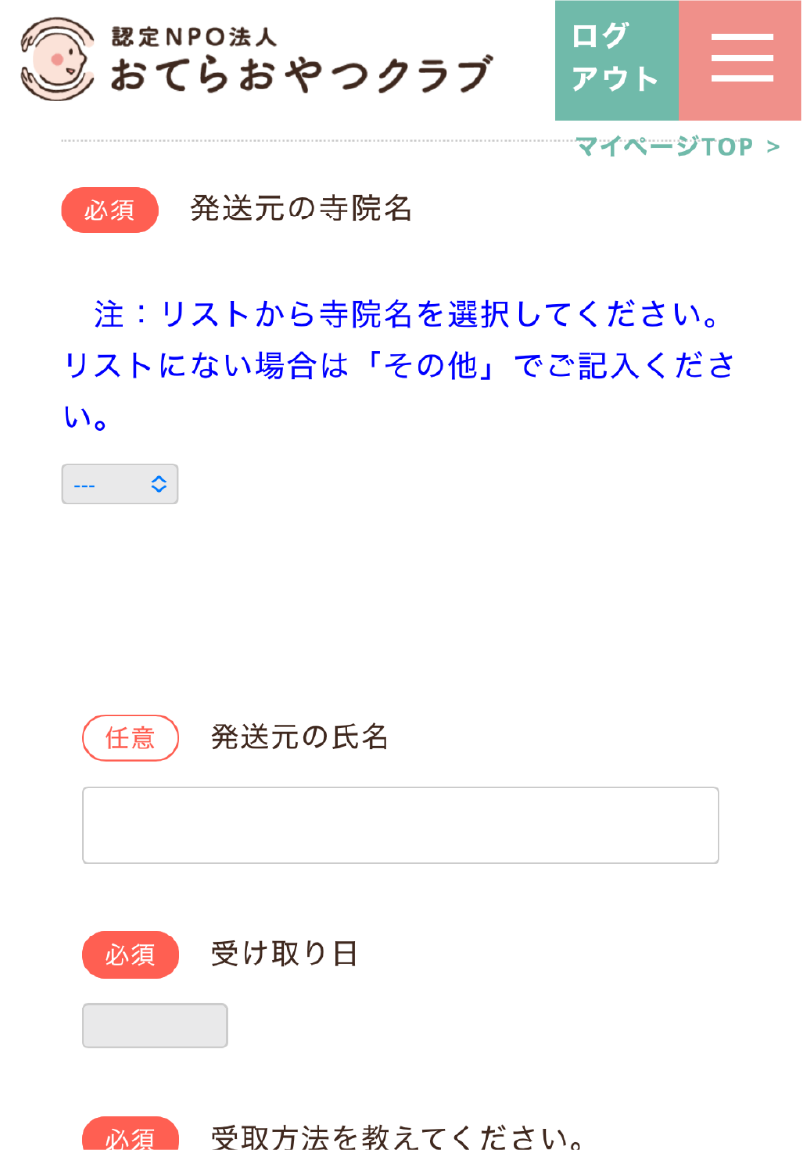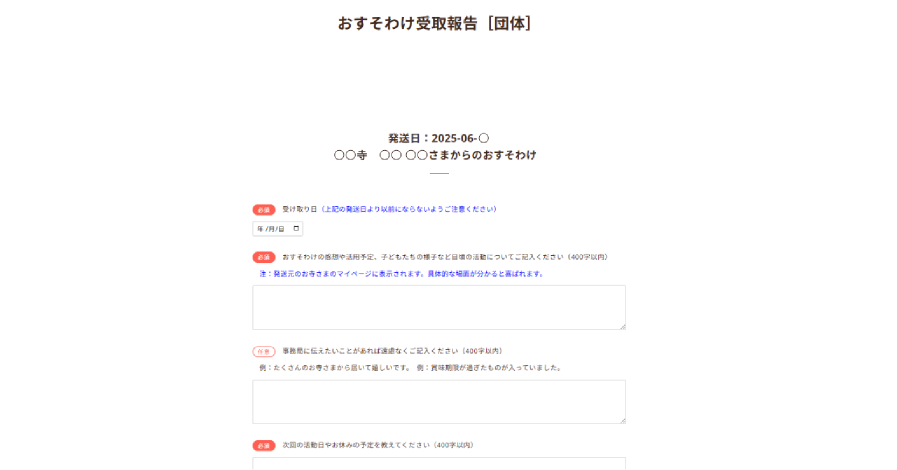 お寺さまから「おすそわけ」が届いたら、必ず受取報告をお願いします。