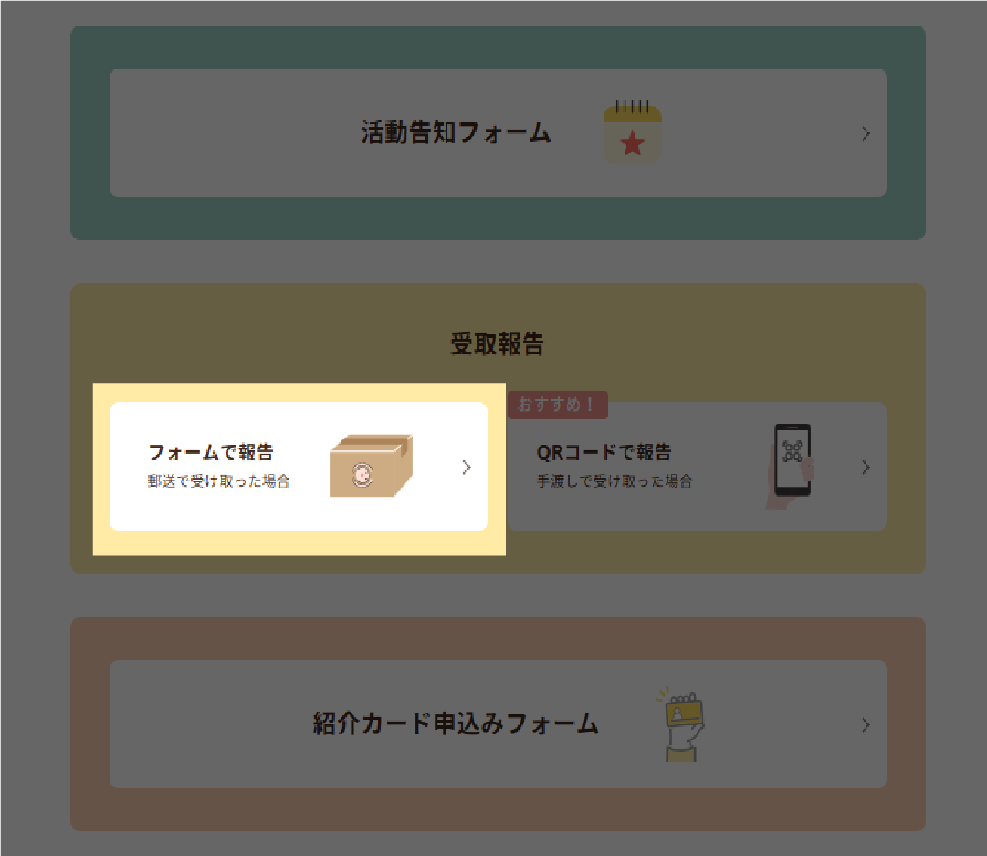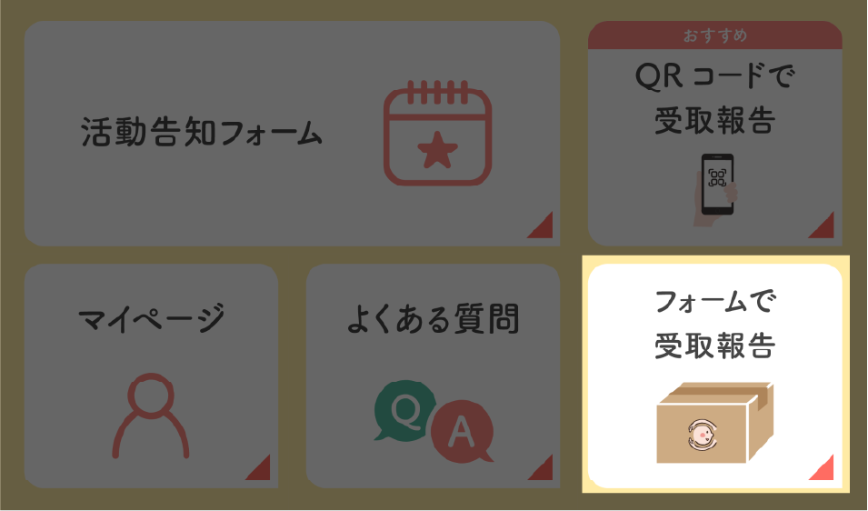 マイページの「フォームで報告」、もしくはLINEリッチメニューの「フォームで受取報告」ボタンを押してください。