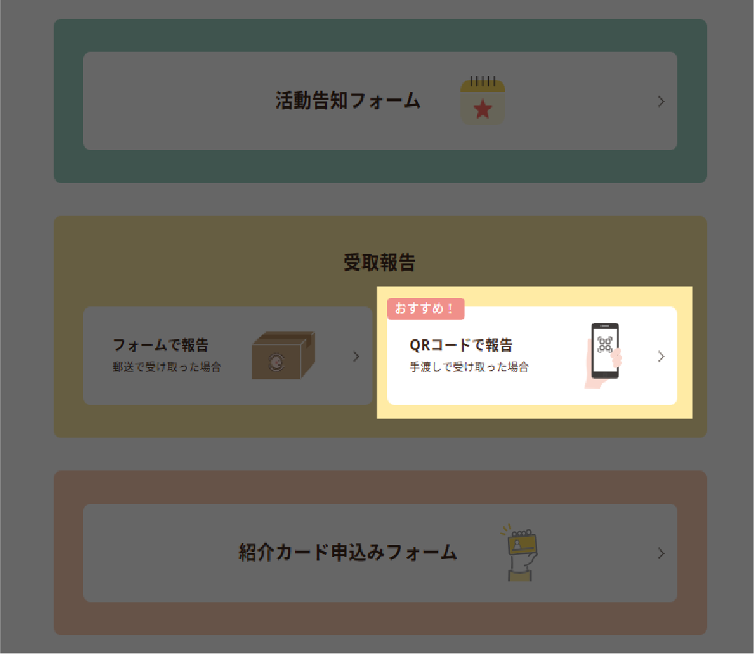 マイページの「QRコードで報告」、もしくはLINEリッチメニューの「QRコードで受取報告」ボタンを押してください。