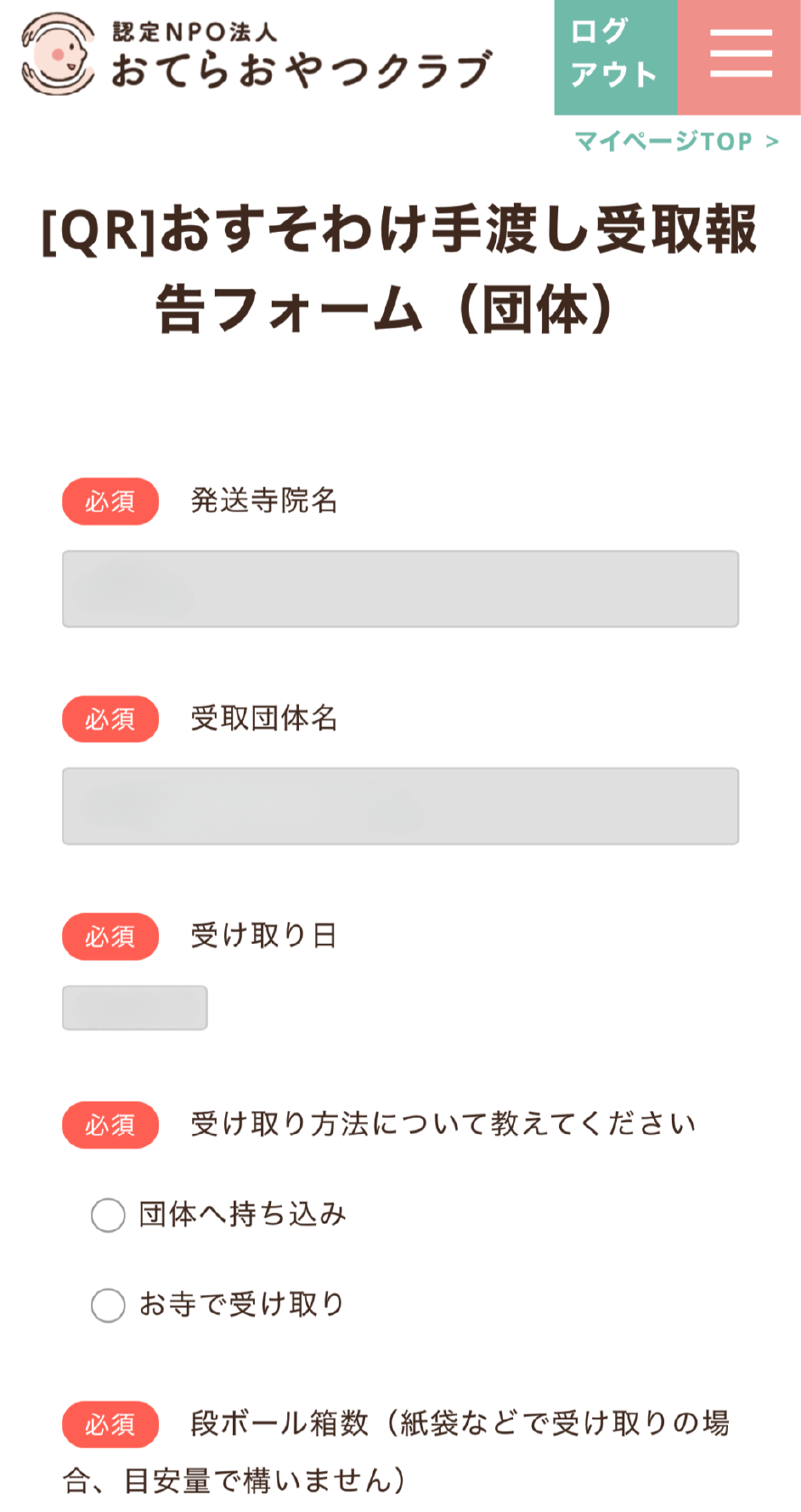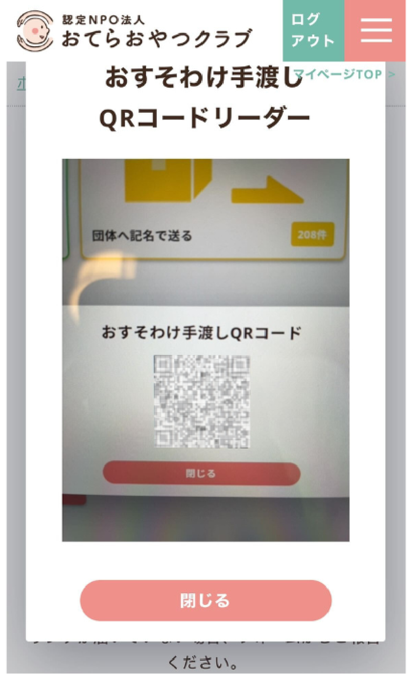 - おすそわけを手渡しで受け取られた際にQRコード読み取りをお忘れの場合は、フォームよりご報告をお願いします。